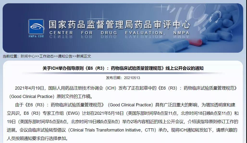 關(guān)于ICH舉辦指導原則《E6(R3):藥物臨床試驗質(zhì)量管理規(guī)范》線上公開會議的通知