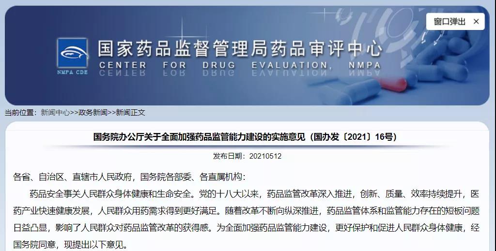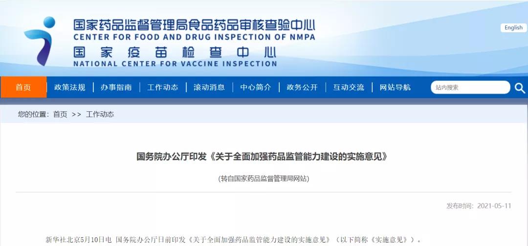 國務(wù)院辦公廳關(guān)于全面加強藥品監(jiān)管能力建設(shè)的實施意見(國辦發(fā)〔2021〕16號)