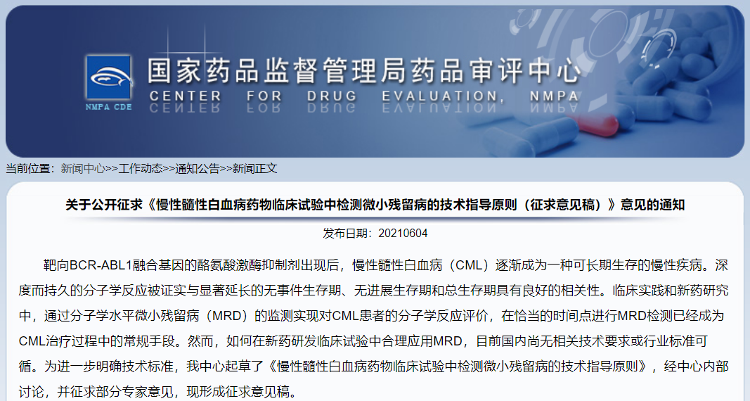 關(guān)于公開征求《慢性髓性白血病藥物臨床試驗中檢測微小殘留病的技術(shù)指導(dǎo)原則(征求意見稿)》意見的通知