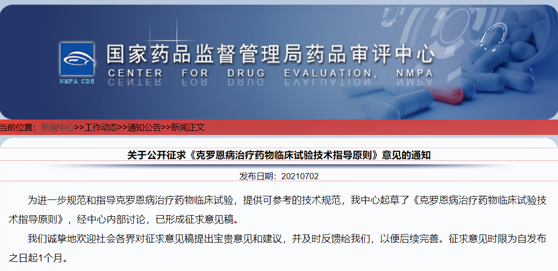 關于公開征求《克羅恩病治療藥物臨床試驗技術指導原則》意見的通知