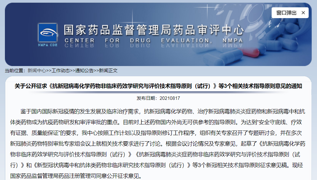 關于公開征求《抗新冠病毒化學藥物非臨床藥效學研究與評價技術指導原則(試行)》等3個相關技術指導原則意見的通知