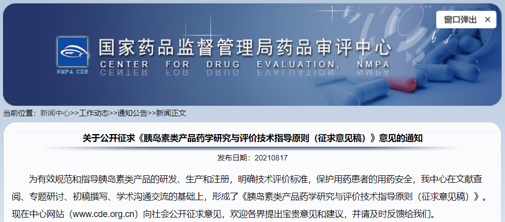 關于公開征求《胰島素類產品藥學研究與評價技術指導原則(征求意見稿)》意見的通知