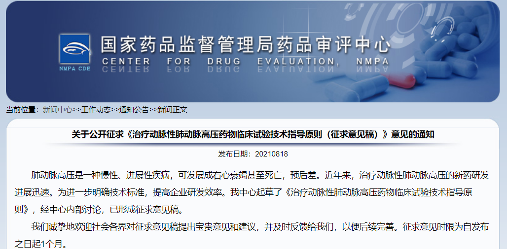 關于公開征求《治療動脈性肺動脈高壓藥物臨床試驗技術指導原則(征求意見稿)》意見的通知