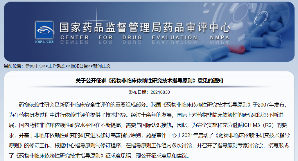 關(guān)于公開征求《藥物非臨床依賴性研究技術(shù)指導原則》意見的通知