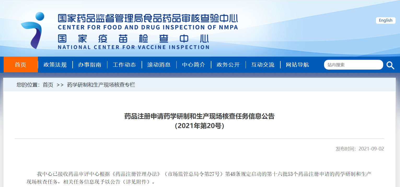 藥品注冊申請藥學研制和生產(chǎn)現(xiàn)場核查任務(wù)信息公告(2021年第20號)