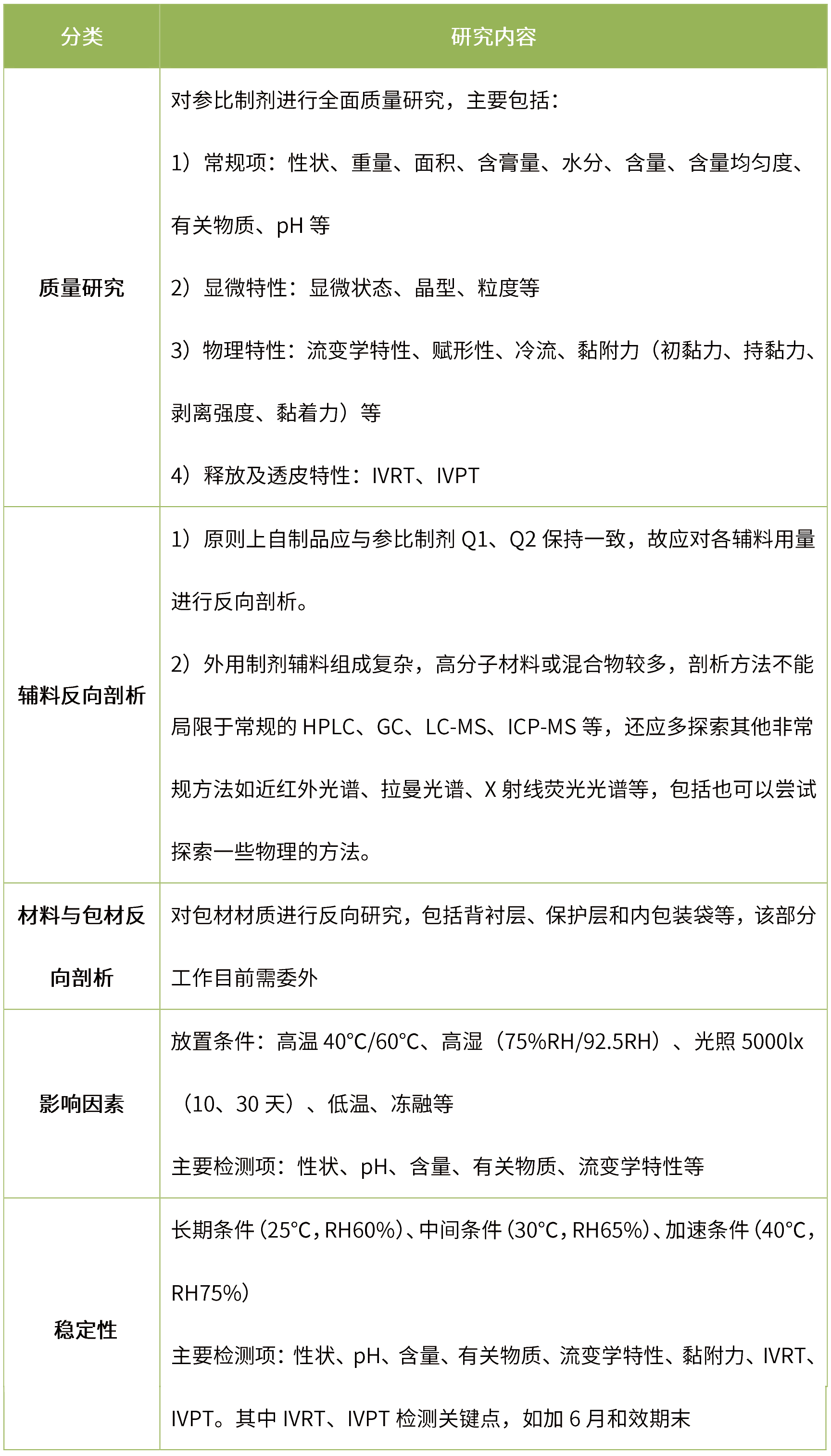 制備過(guò)程是否避光: 考察制膏及涂布過(guò)程是否需要避光,主要指標(biāo)為性狀、有關(guān)物質(zhì)等。