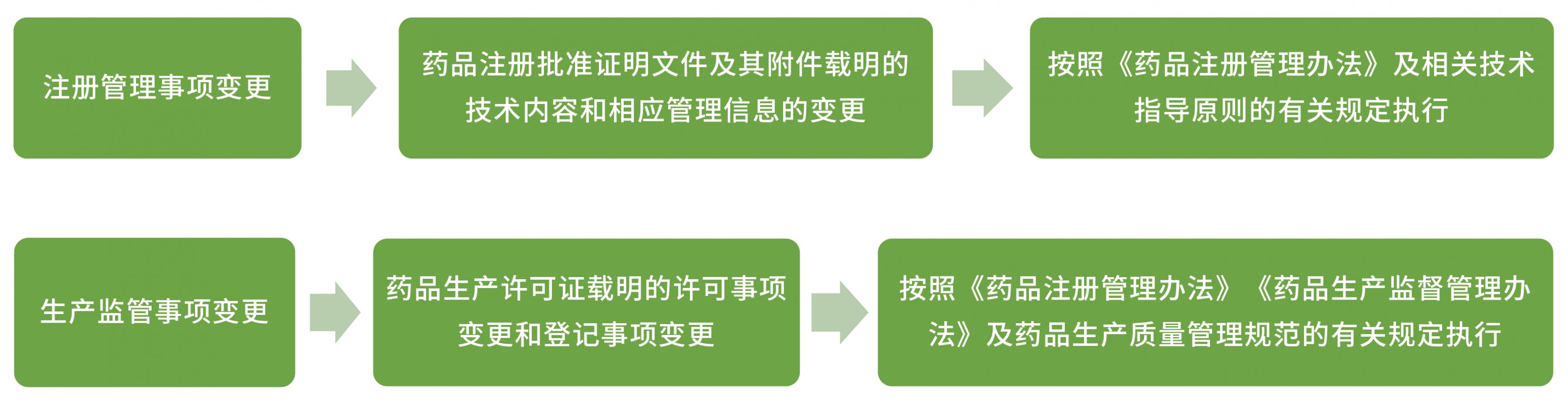 藥品上市后變更包括注冊管理事項(xiàng)變更和生產(chǎn)監(jiān)管事項(xiàng)變更,也就是涉及注冊批件和生產(chǎn)許可證相關(guān)事項(xiàng)的變更。依據(jù)變更對藥品安全性、有效性和質(zhì)量可控性的風(fēng)險(xiǎn)和產(chǎn)生影響的程度,將變更劃分為審評類變更,備案類變更和報(bào)告類變更。