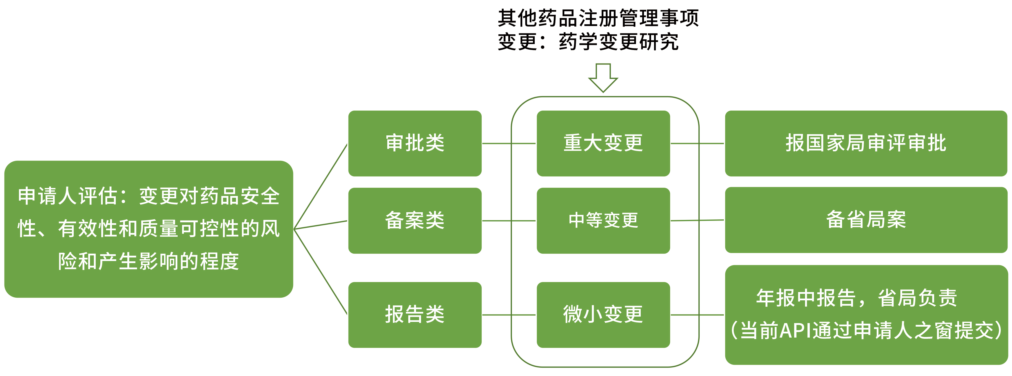 依據(jù)變更對藥品安全性、有效性、質(zhì)量可控性的影響,將藥學(xué)變更分為微小變更、中等變更和重大變更,由申請人依據(jù)對產(chǎn)品的理解進(jìn)行評估及相應(yīng)的研究、申報(bào)工作。
