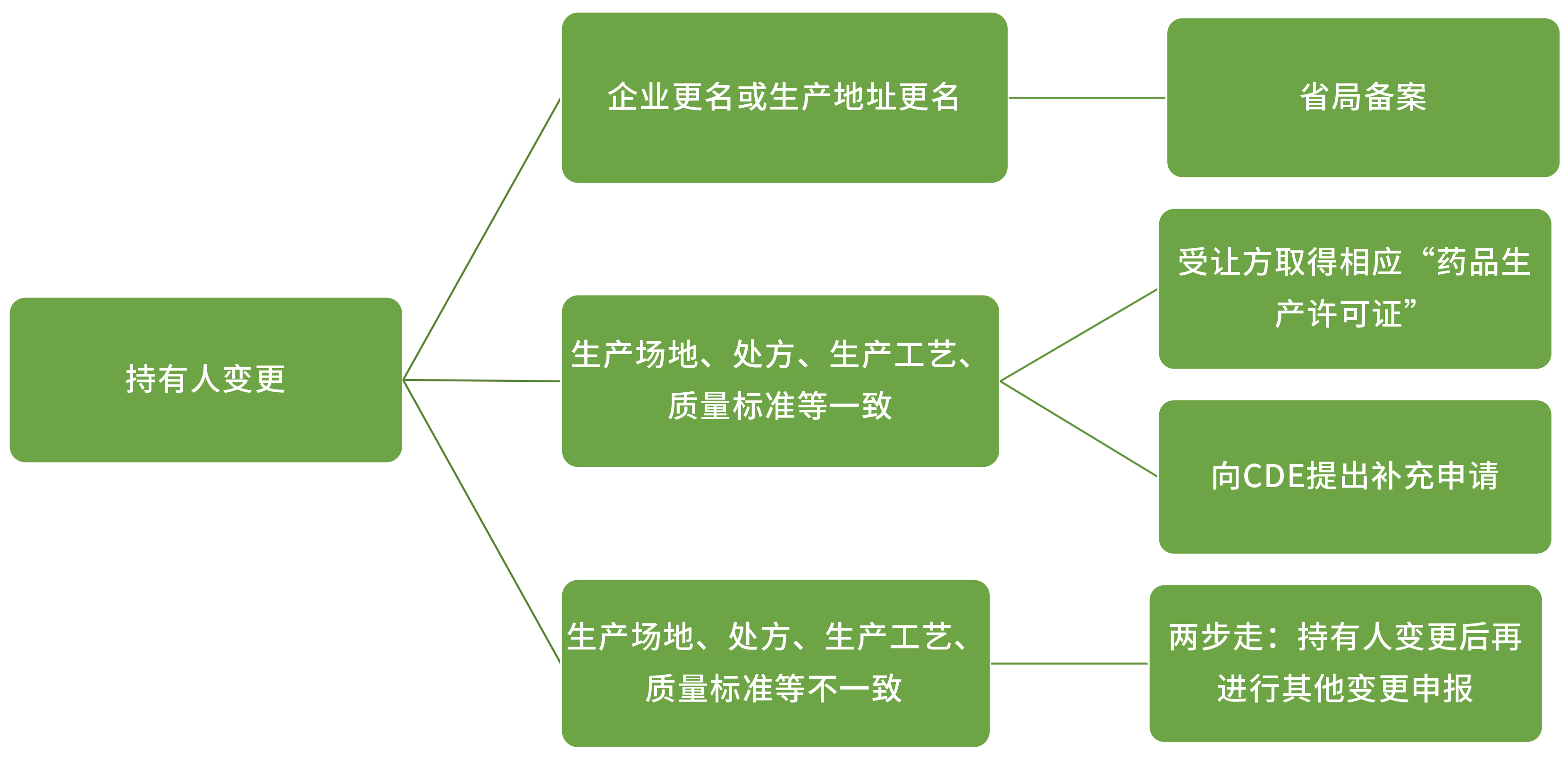 除以上變更外,《藥品上市后變更管理辦法(試行)》及《已上市化學(xué)藥品藥學(xué)變更研究技術(shù)指導(dǎo)原則(試行)》對持有人及生產(chǎn)場地的變更流程及研究內(nèi)容進(jìn)行了明確的規(guī)定。