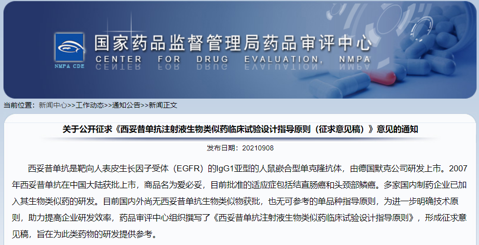 關于公開征求《西妥昔單抗注射液生物類似藥臨床試驗設計指導原則(征求意見稿)》意見的通知