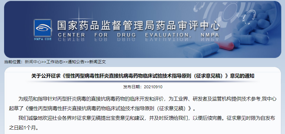 關于公開征求《慢性丙型病毒性肝炎直接抗病毒藥物臨床試驗技術指導原則(征求意見稿)》意見的通知