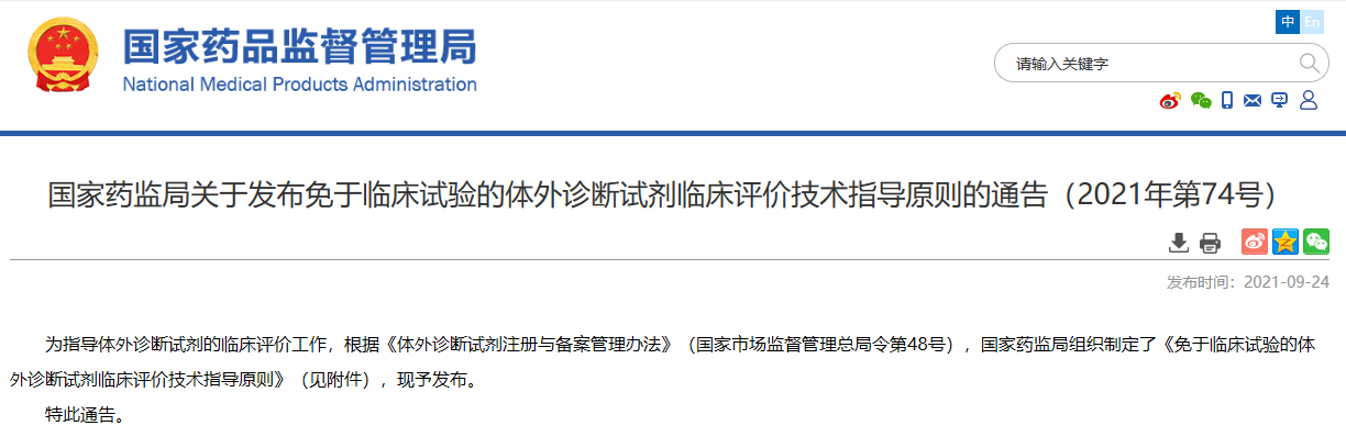 關(guān)于發(fā)布免于臨床試驗(yàn)的體外診斷試劑臨床評(píng)價(jià)技術(shù)指導(dǎo)原則的通告(2021年第74號(hào))
