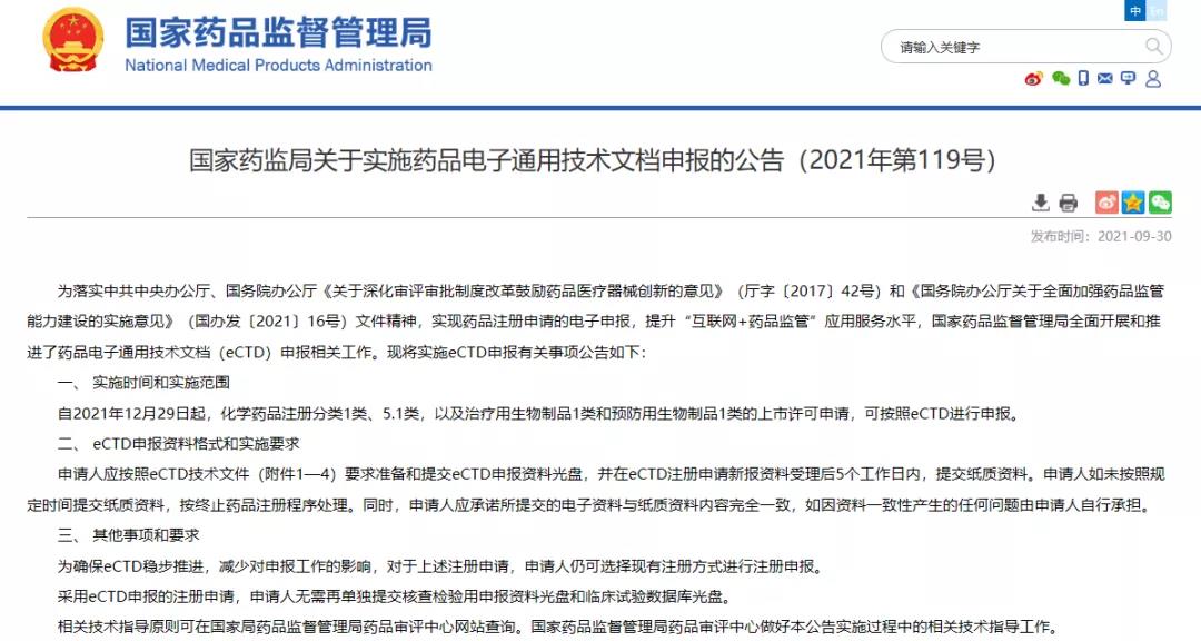 國家藥監(jiān)局關(guān)于實施藥品電子通用技術(shù)文檔申報的公告(2021年第119號)