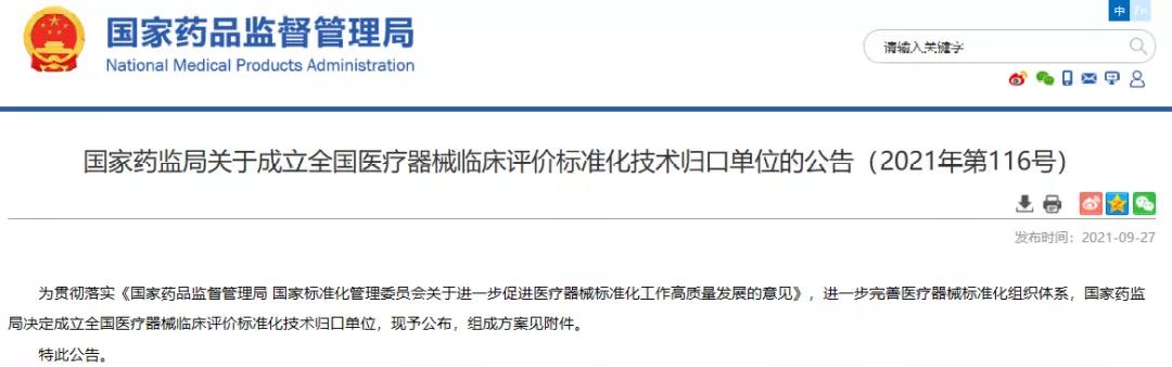 國家藥監(jiān)局關(guān)于成立全國醫(yī)療器械臨床評價標準化技術(shù)歸口單位的公告(2021年第116號)