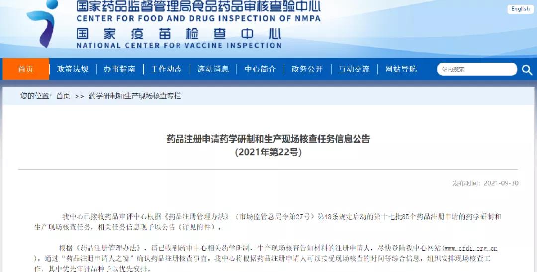 藥品注冊申請藥學(xué)研制和生產(chǎn)現(xiàn)場核查任務(wù)信息公告(2021年第22號)