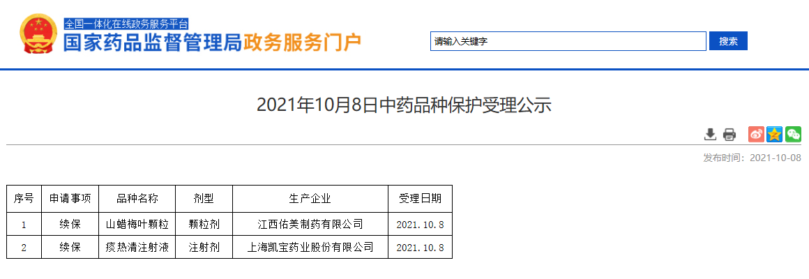 2021年10月8日中藥品種保護受理公示