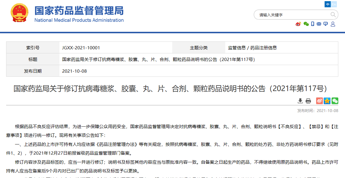 國家藥監(jiān)局關(guān)于修訂抗病毒糖漿、膠囊、丸、片、合劑、顆粒藥品說明書的公告(2021年第117號)