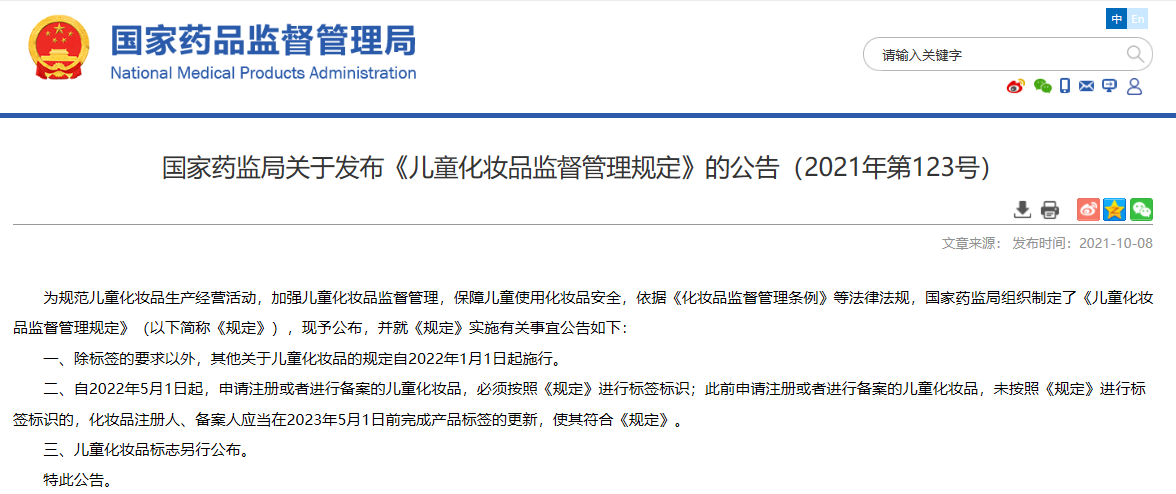 國家藥監(jiān)局關(guān)于發(fā)布《兒童化妝品監(jiān)督管理規(guī)定》的公告(2021年第123號