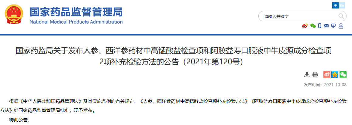 國家藥監(jiān)局關(guān)于發(fā)布人參、西洋參藥材中高錳酸鹽檢查項和阿膠益壽口服液中牛皮源成分檢查項2項補充檢驗方法的公告(2021年第120號)