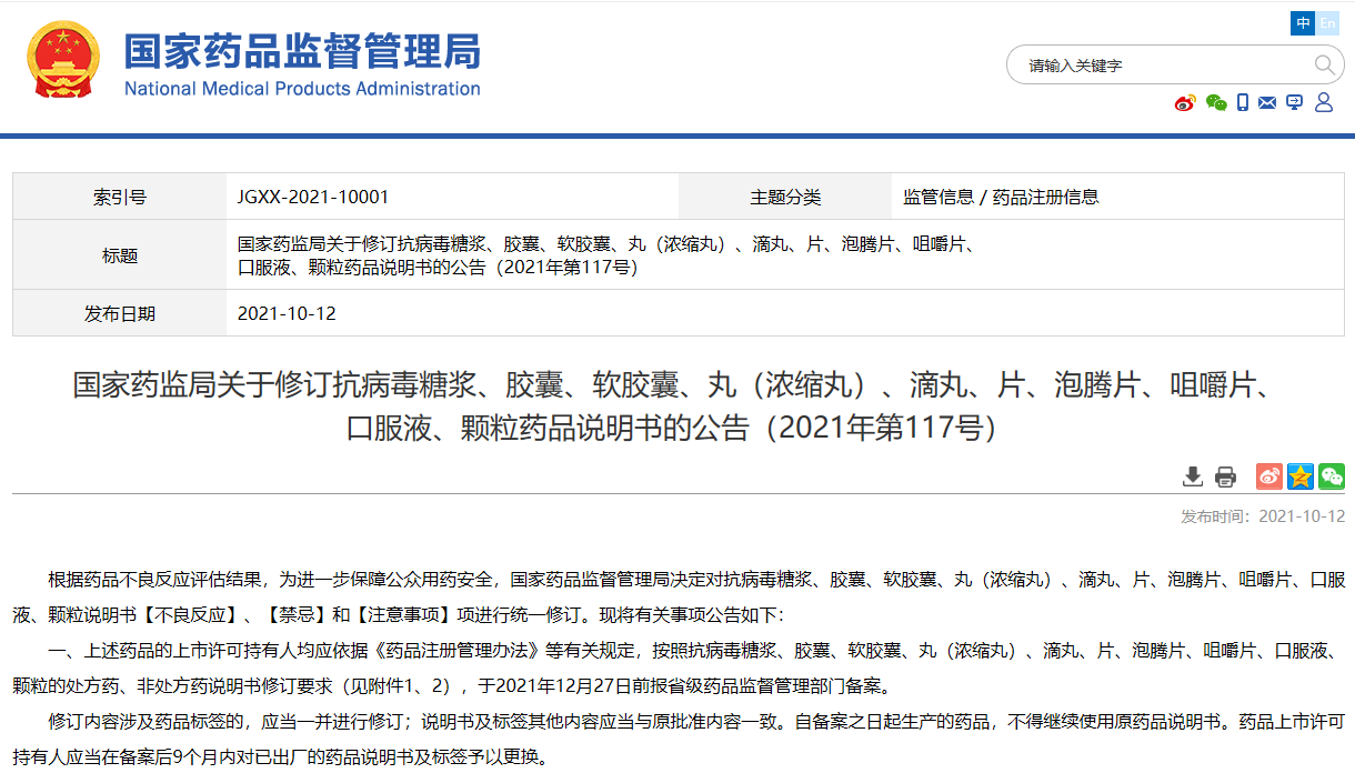 國家藥監(jiān)局關(guān)于修訂抗病毒糖漿、膠囊、軟膠囊、丸(濃縮丸)、滴丸、片、泡騰片、咀嚼片、口服液、顆粒藥品說明書的公告(2021年第117號)