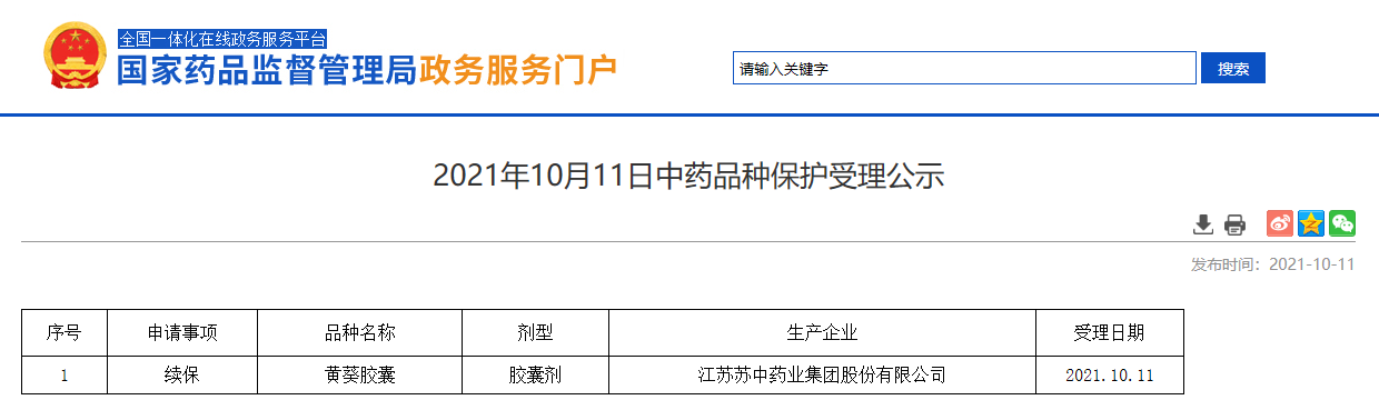 2021年10月11日中藥品種保護受理公示