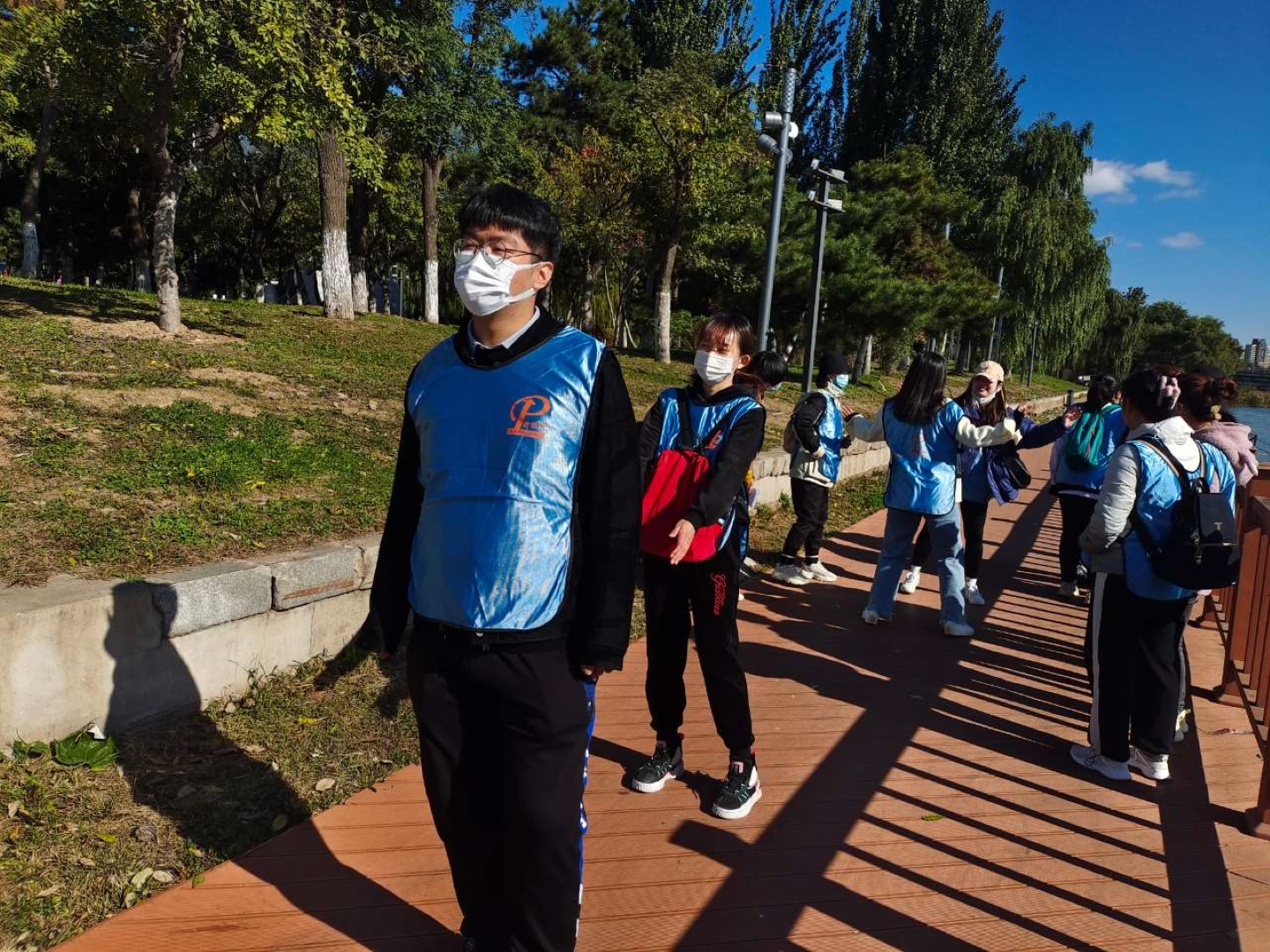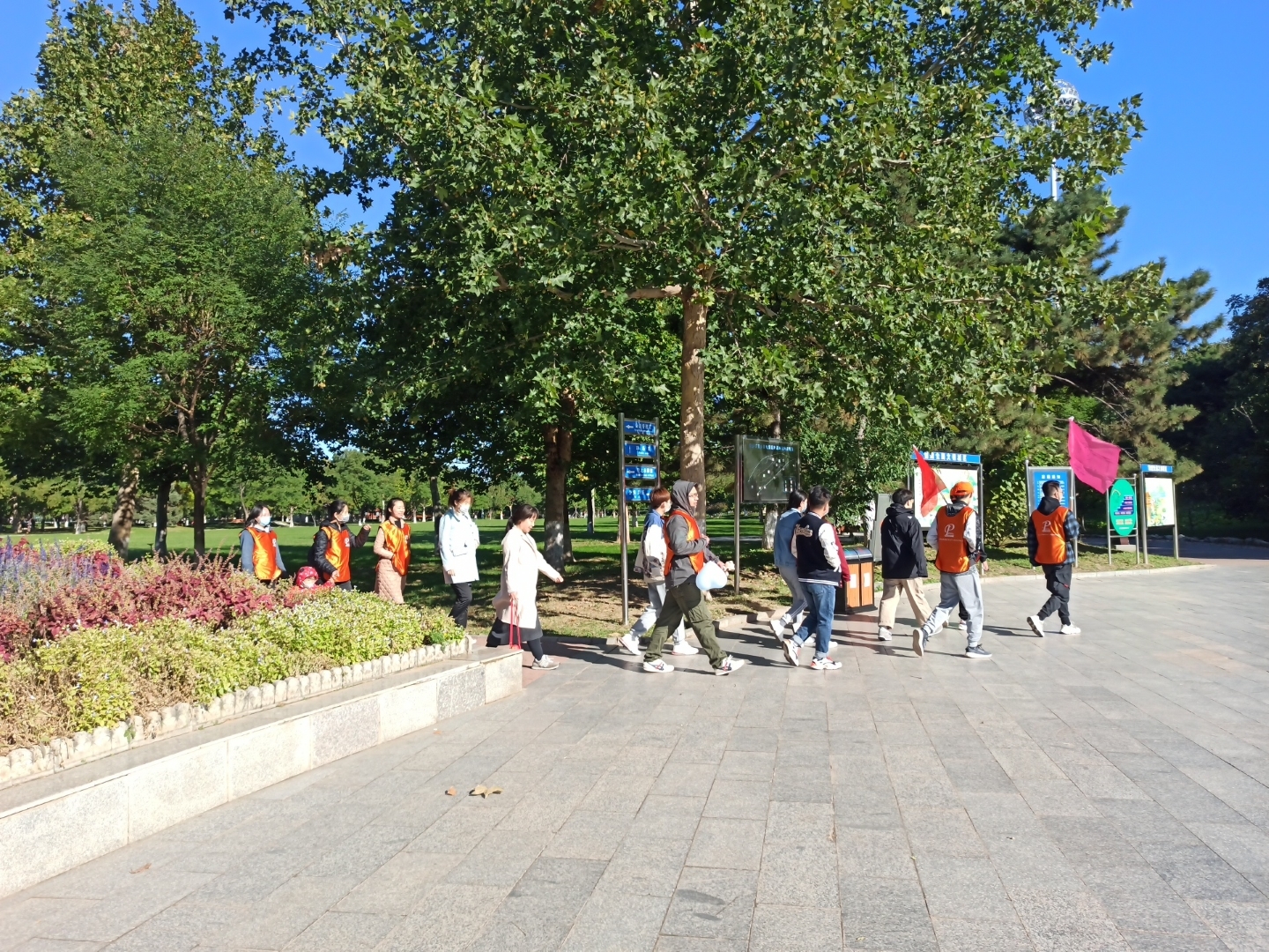▲各隊隊員高舉隊旗,耳聽秋風(fēng),腳踩落葉,有說有笑,相伴同行