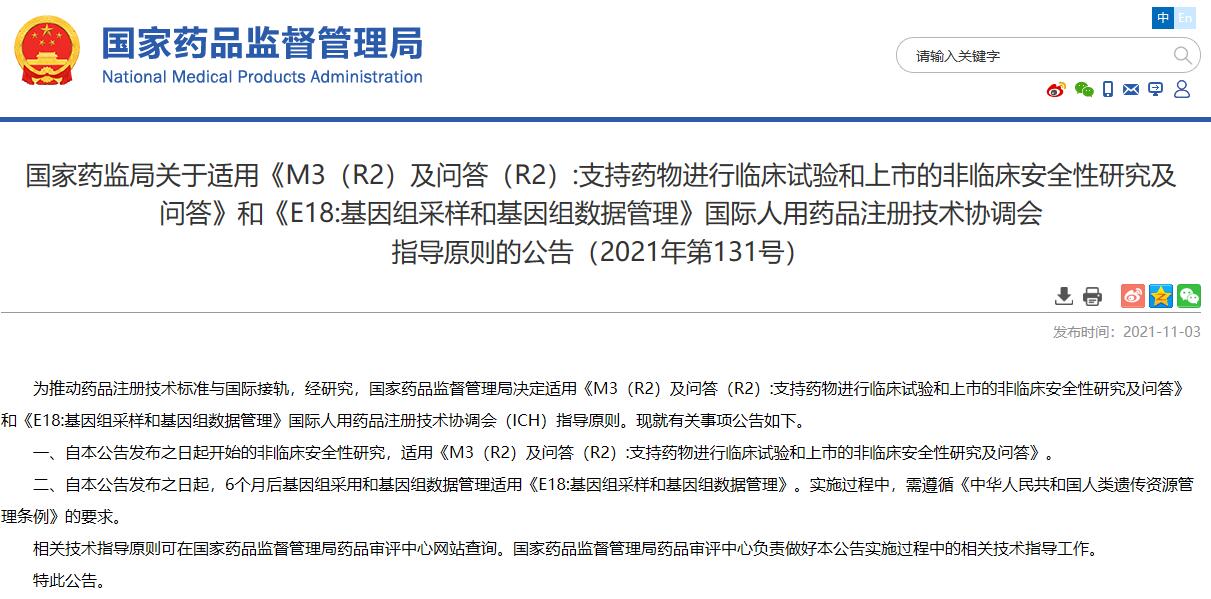 國(guó)家藥監(jiān)局關(guān)于適用《M3(R2)及問(wèn)答(R2):支持藥物進(jìn)行臨床試驗(yàn)和上市的非臨床安全性研究及問(wèn)答》和《E18:基因組采樣和基因組數(shù)據(jù)管理》國(guó)際人用藥品注冊(cè)技術(shù)協(xié)調(diào)會(huì)指導(dǎo)原則的公告(2021年第131號(hào))