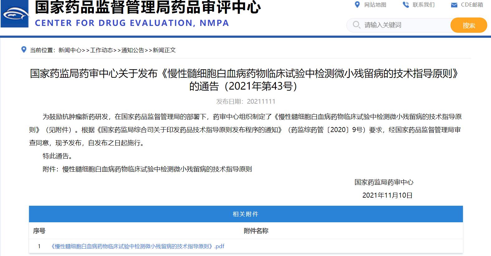 國(guó)家藥監(jiān)局藥審中心關(guān)于發(fā)布《慢性髓細(xì)胞白血病藥物臨床試驗(yàn)中檢測(cè)微小殘留病的技術(shù)指導(dǎo)原則》的通告