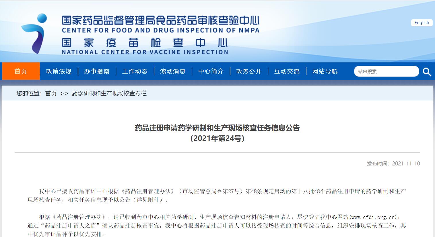 藥品注冊(cè)申請(qǐng)藥學(xué)研制和生產(chǎn)現(xiàn)場(chǎng)核查任務(wù)信息公告(2021年第24號(hào))