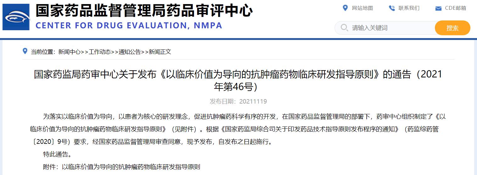 國家藥監(jiān)局藥審中心關(guān)于發(fā)布《以臨床價值為導(dǎo)向的抗腫瘤藥物臨床研發(fā)指導(dǎo)原則》的通告(2021年第46號)