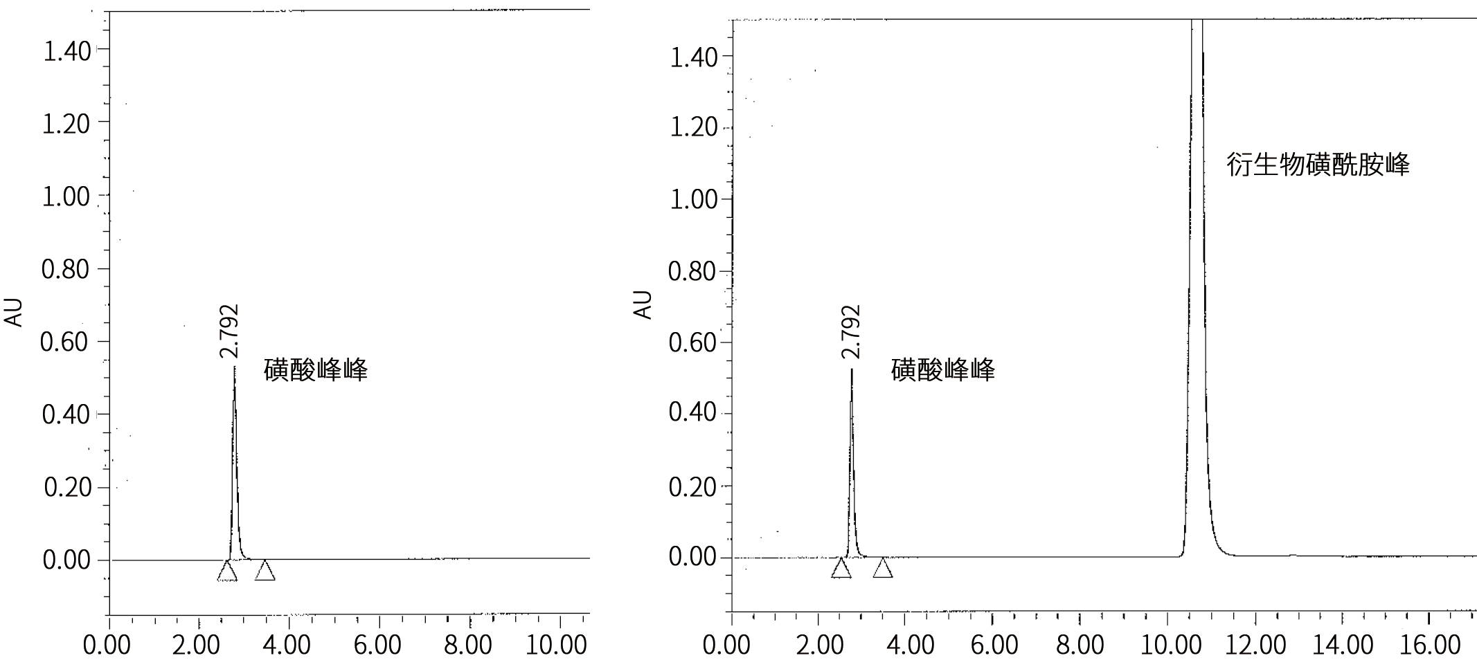從上圖中可以看出,磺酸與磺酰氯衍生物磺酰胺分離度良好,且磺酸類雜質(zhì)不與氨水反應(yīng)生成酰胺,該方法可準(zhǔn)確有效地檢測(cè)磺酰氯化合物中磺酸類雜質(zhì)。