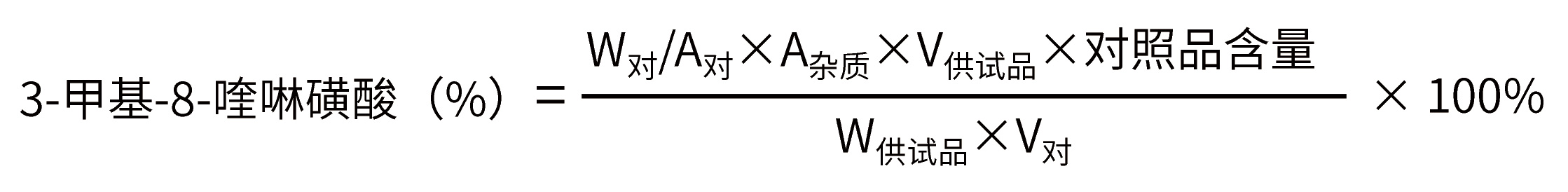 注:W對(duì):對(duì)照品溶液稱樣量,mg; W供試品:供試品稱樣量,mg; A對(duì):對(duì)照品溶液色譜圖中3-甲基-8-喹啉磺酸峰面積; A雜質(zhì):供試品溶液色譜圖中3-甲基-8-喹啉磺酸峰面積; V對(duì):對(duì)照品溶液的稀釋倍數(shù); V供試品:供試品溶液的稀釋倍數(shù)。