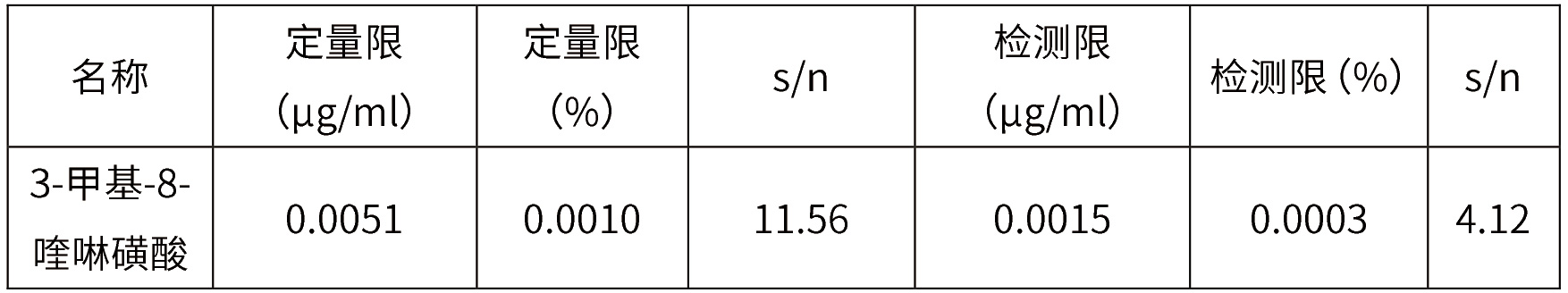 結(jié)論:3-甲基-8-喹啉磺酸定量限小于報(bào)告限度(0.05%)的50%,檢測(cè)限小于定量限的0.5倍,方法靈敏度符合要求。