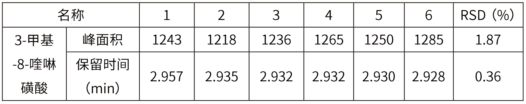 對(duì)照品溶液中3-甲基-8-喹啉磺酸各色譜參數(shù)符合要求,空白溶劑不干擾3-甲基-8-喹啉磺酸檢測(cè),專屬性良好。