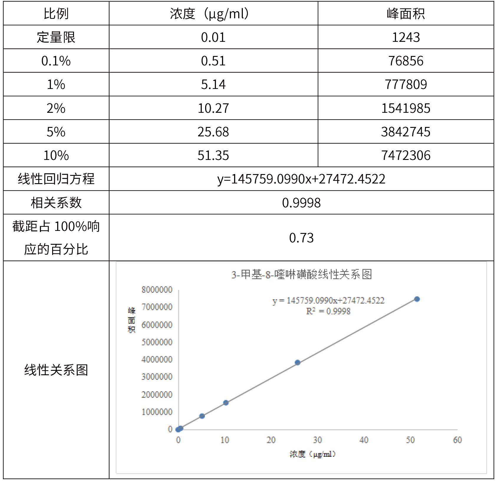 結(jié)論:3-甲基-8-喹啉磺酸在0.01~51.35μg/ml濃度范圍內(nèi),R2>0.999,濃度與峰面積之間線性關(guān)系良好。