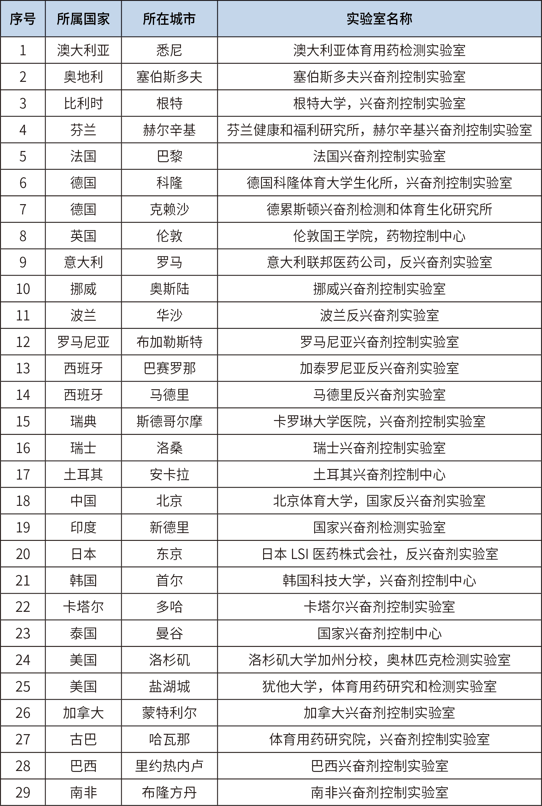 目前全世界共有興奮劑檢測(cè)實(shí)驗(yàn)室29個(gè),分布在五大洲,其中歐洲16個(gè),亞洲6個(gè),北美洲4個(gè),大洋洲、南美洲和非洲各1個(gè),詳見下表: