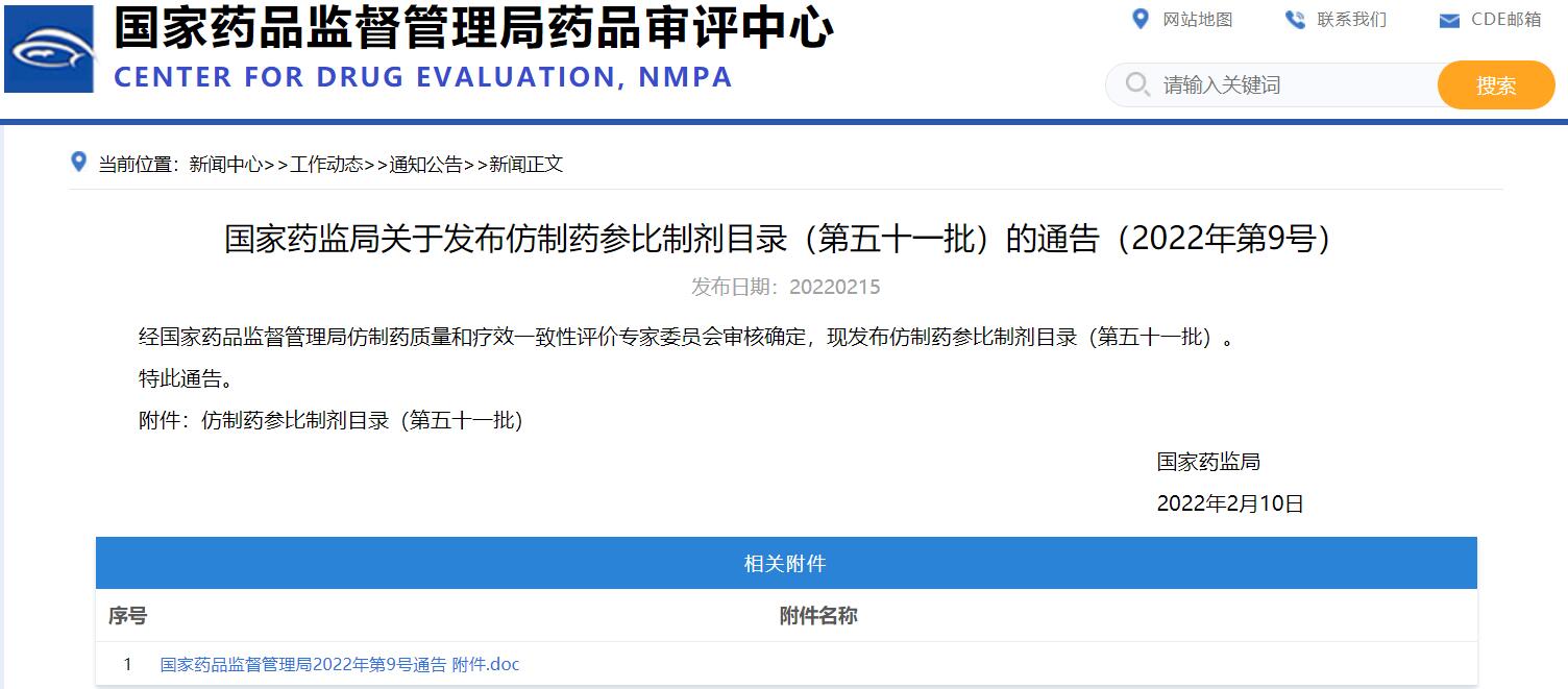 國家藥監(jiān)局關(guān)于發(fā)布仿制藥參比制劑目錄(第五十一批)的通告(2022年第9號)