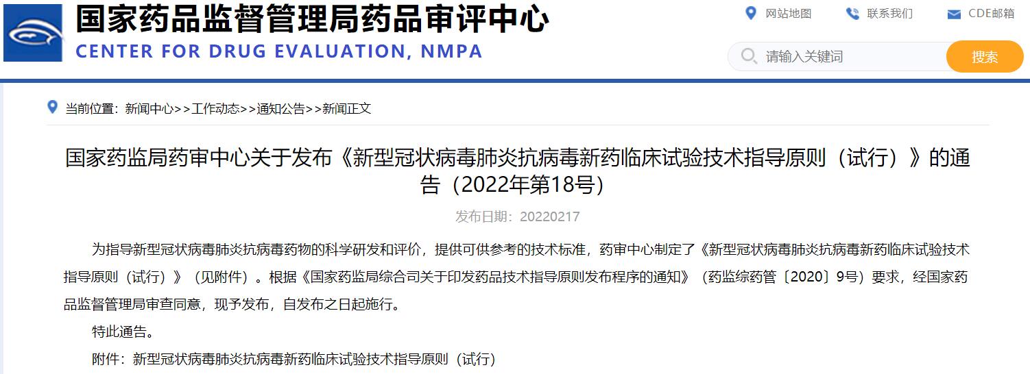 國家藥監(jiān)局藥審中心關(guān)于發(fā)布《新型冠狀病毒肺炎抗病毒新藥臨床試驗(yàn)技術(shù)指導(dǎo)原則(試行)》的通告(2022年第18號)