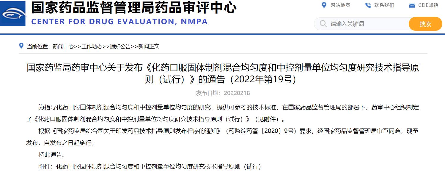 國家藥監(jiān)局藥審中心關(guān)于發(fā)布《化藥口服固體制劑混合均勻度和中控劑量單位均勻度研究技術(shù)指導(dǎo)原則(試行)》的通告(2022年第19號)