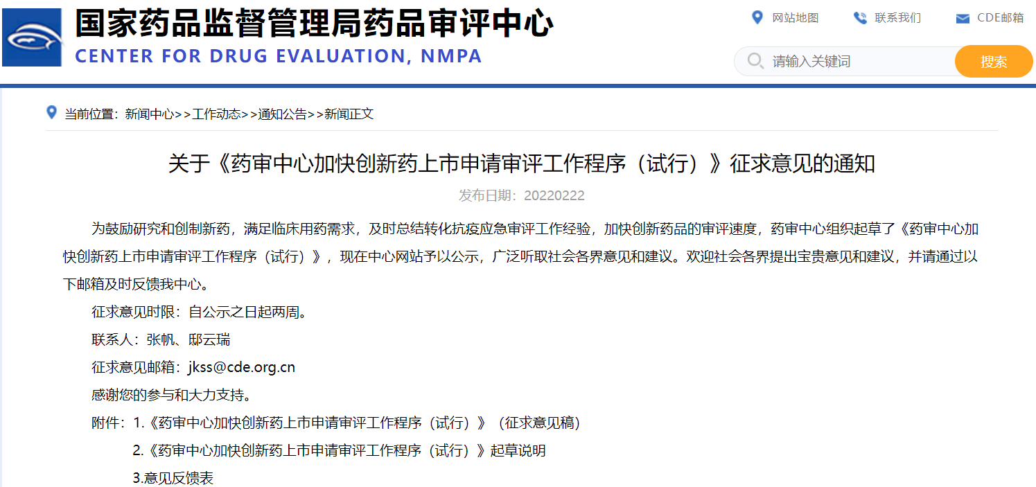 關于《藥審中心加快創(chuàng)新藥上市申請審評工作程序(試行)》征求意見的通知