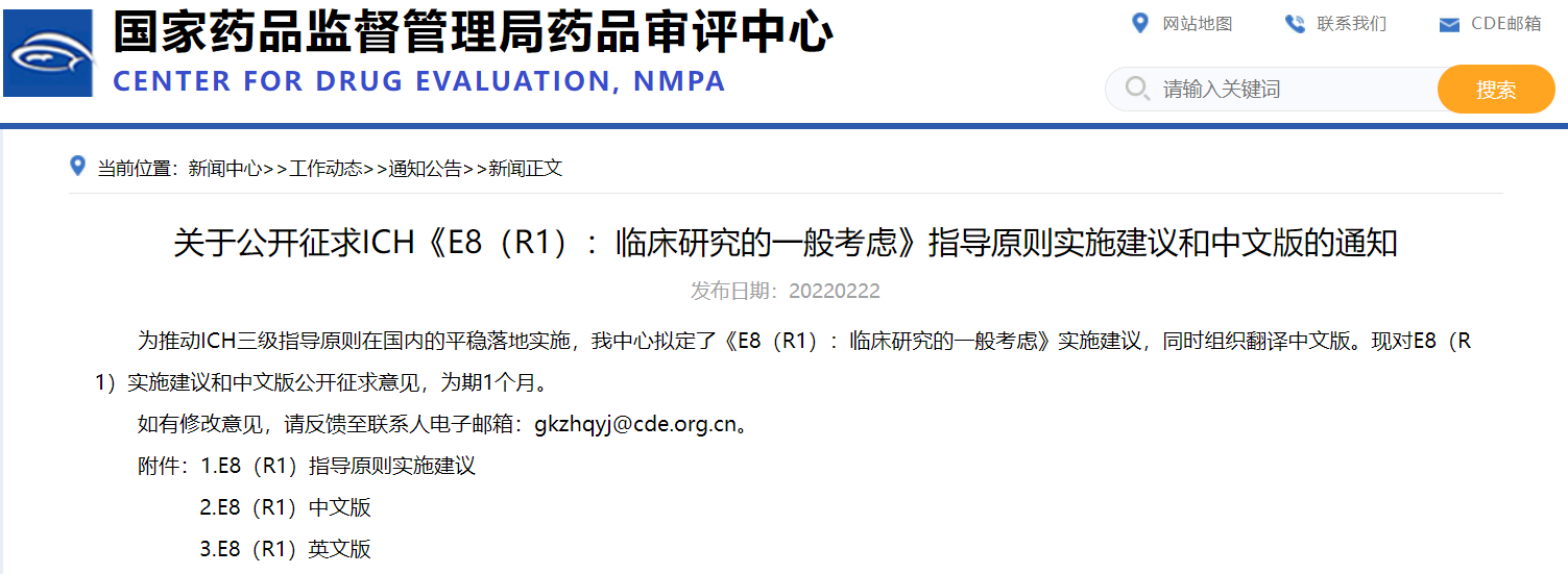 關于公開征求ICH《E8(R1):臨床研究的一般考慮》指導原則實施建議和中文版的通知