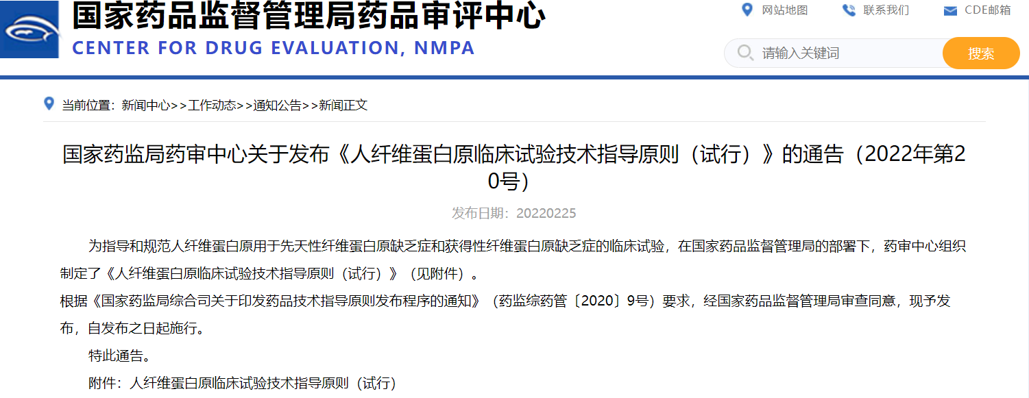 國家藥監(jiān)局藥審中心關于發(fā)布《人纖維蛋白原臨床試驗技術指導原則(試行)》的通告(2022年第20號)