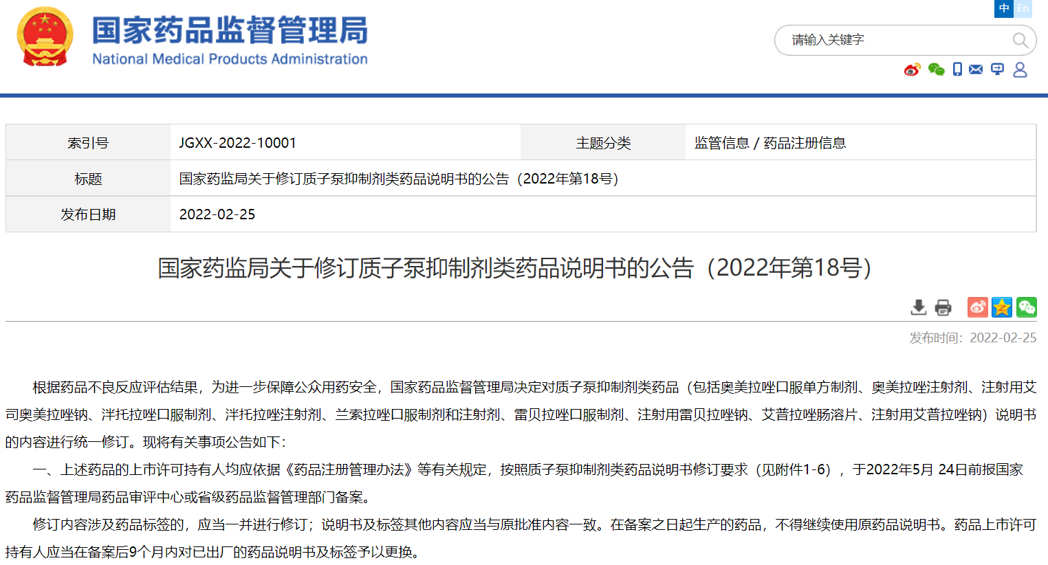 國家藥監(jiān)局關于修訂質(zhì)子泵抑制劑類藥品說明書的公告(2022年第18號)