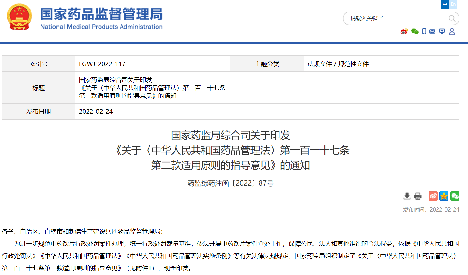 國家藥監(jiān)局綜合司關于印發(fā) 《關于〈中華人民共和國藥品管理法〉第一百一十七條 第二款適用原則的指導意見》的通知