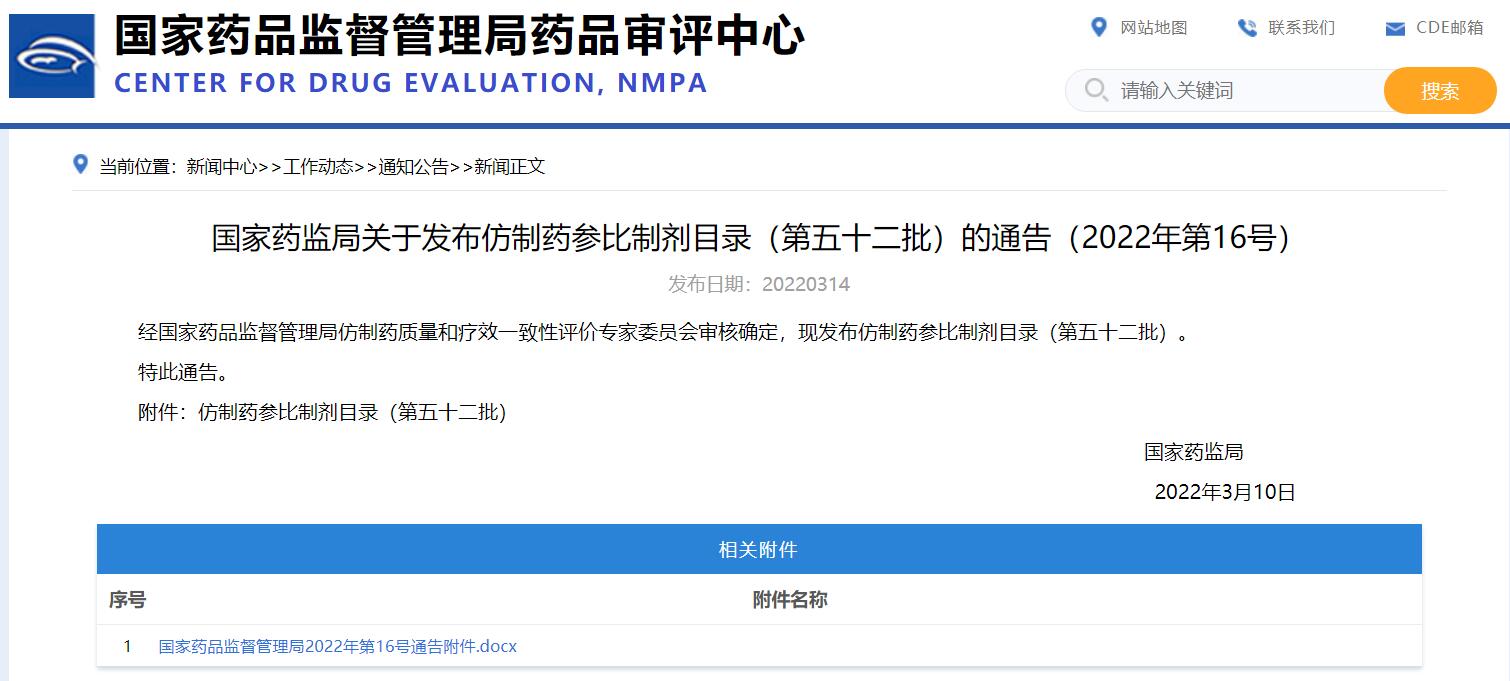 國家藥監(jiān)局關(guān)于發(fā)布仿制藥參比制劑目錄(第五十二批)的通告(2022年第16號)