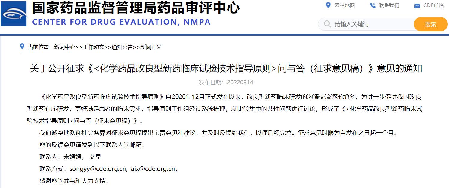 關(guān)于公開征求《<化學(xué)藥品改良型新藥臨床試驗技術(shù)指導(dǎo)原則>問與答(征求意見稿)》意見的通知