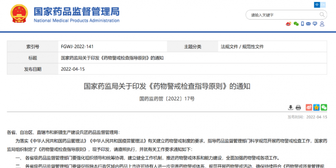 政策法規(guī)||國(guó)家藥監(jiān)局發(fā)布《藥物警戒檢查指導(dǎo)原則》(附本周法規(guī)概覽04.11-04.15)