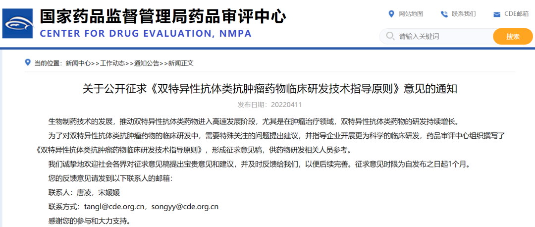 關(guān)于公開征求《雙特異性抗體類抗腫瘤藥物臨床研發(fā)技術(shù)指導(dǎo)原則》意見的通知