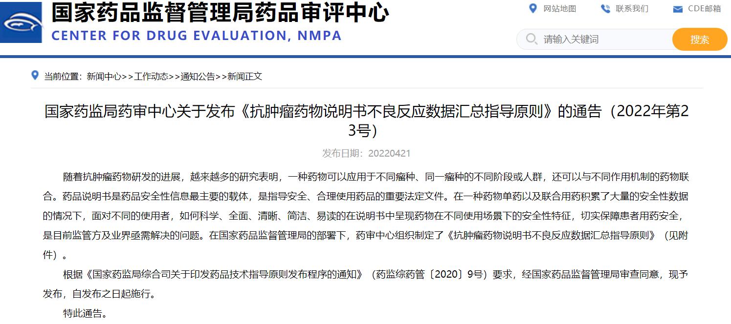 國(guó)家藥監(jiān)局藥審中心關(guān)于發(fā)布《抗腫瘤藥物說(shuō)明書(shū)不良反應(yīng)數(shù)據(jù)匯總指導(dǎo)原則》的通告(2022年第23號(hào))