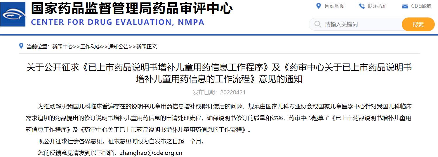 關(guān)于公開(kāi)征求《已上市藥品說(shuō)明書(shū)增補(bǔ)兒童用藥信息工作程序》及《藥審中心關(guān)于已上市藥品說(shuō)明書(shū)增補(bǔ)兒童用藥信息的工作流程》意見(jiàn)的通知